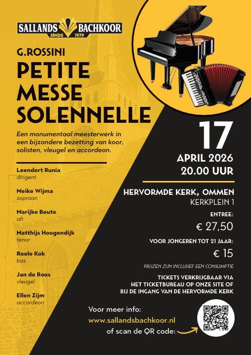 Vrijdag 17 april 2026, 's avonds om 20.00 uur, voert het Sallands Bachkoor de Petite Messe Solennelle van Gioacchino Rossini uit. Deze mis wordt wel hét ultieme meesterwerk van zijn hand genoemd! Het wordt wereldwijd geroemd om de verrassende mix van grootsheid en verfijnde details.